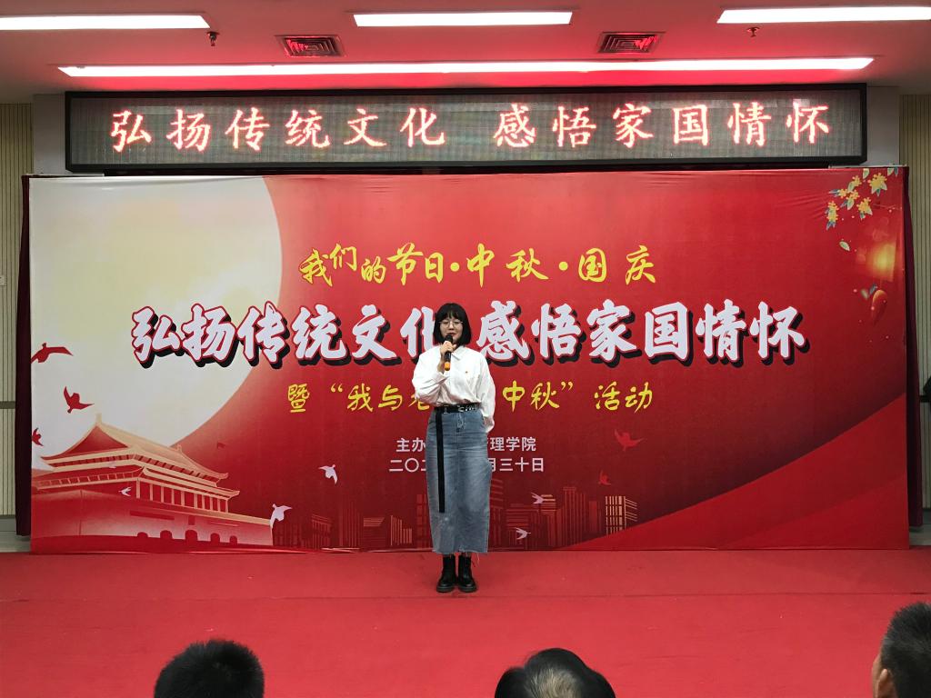 紧接着,马克思主义公司经理易承宗与我们一起分享中秋佳句,品味了与月亮有关的诗词,带领全场师生一起走进“海上生明月”“但愿人长久”的浩瀚诗境,感受中国传统文化的滋养,引起了现场员工的共鸣。经管院的同学们来自五湖四海,几位来自少数民族的同学也分享了自己家乡在过中秋节时的风俗习惯,把壮族挂柚子、苗族打糍粑的过节氛围带到了现场。
