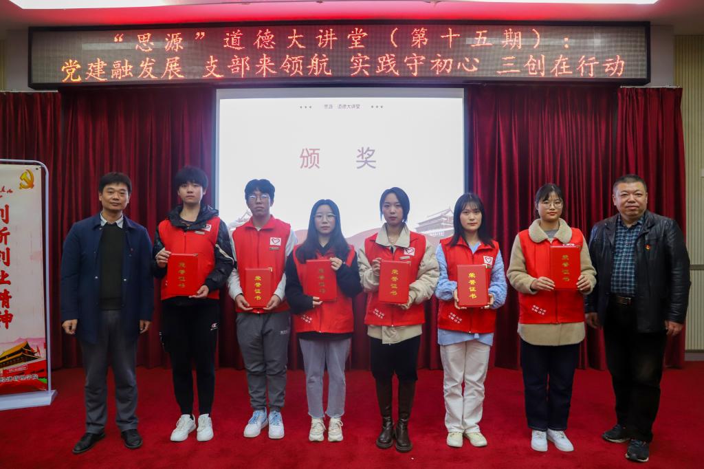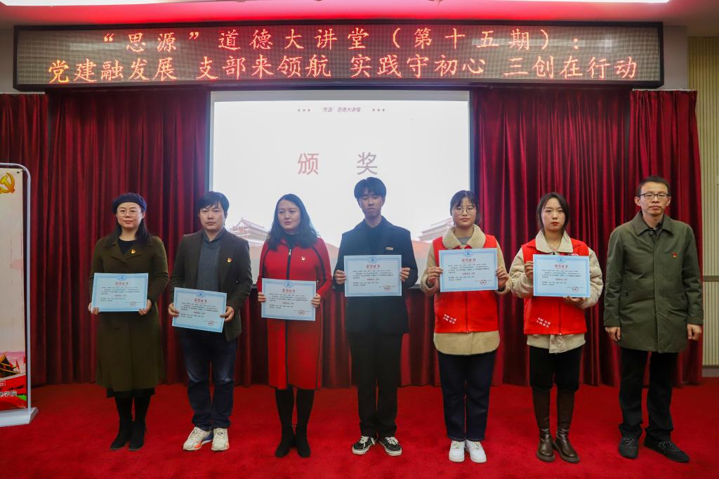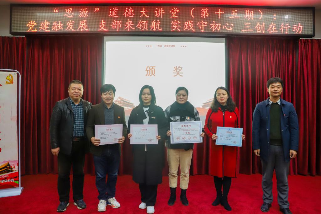 本期道德大讲堂从“创新创业精神、志愿服务精神”为切入点,通过集体向“德”鞠躬、宣讲团队讲述分享、领导点评、颁奖、写感言卡等五个环节开展。