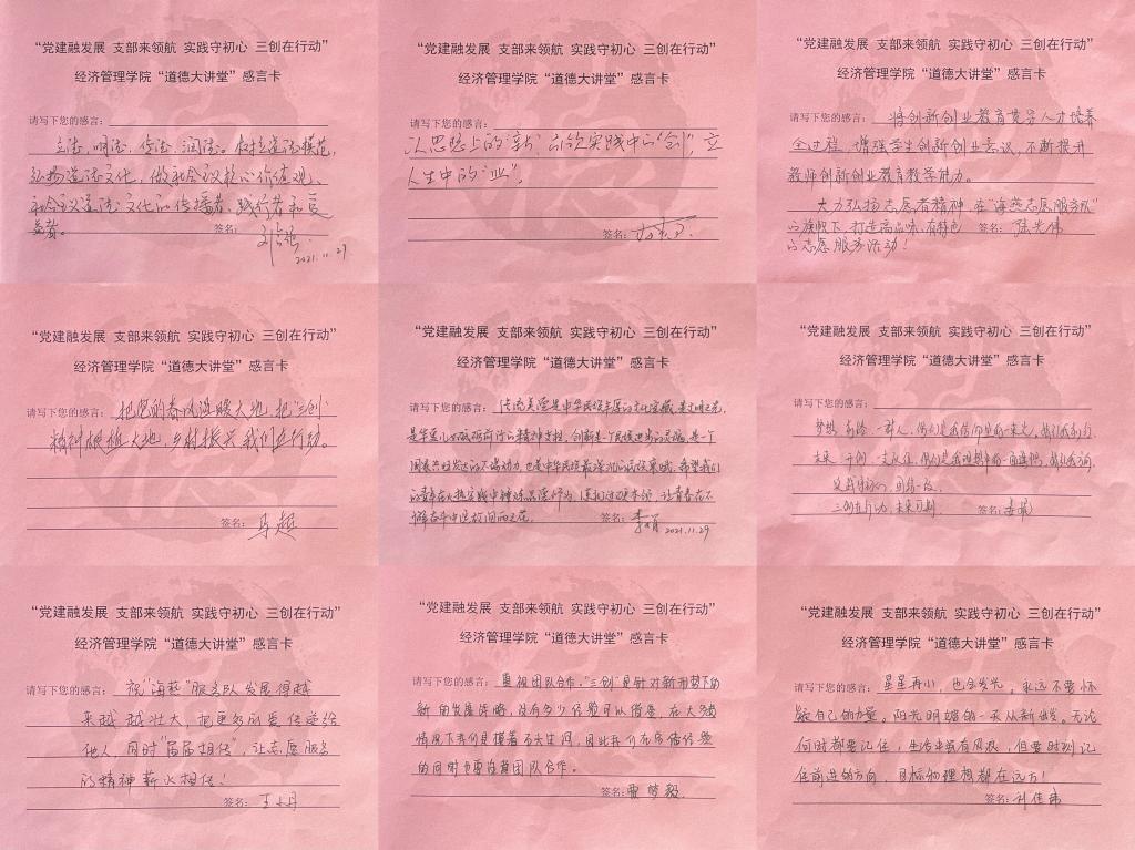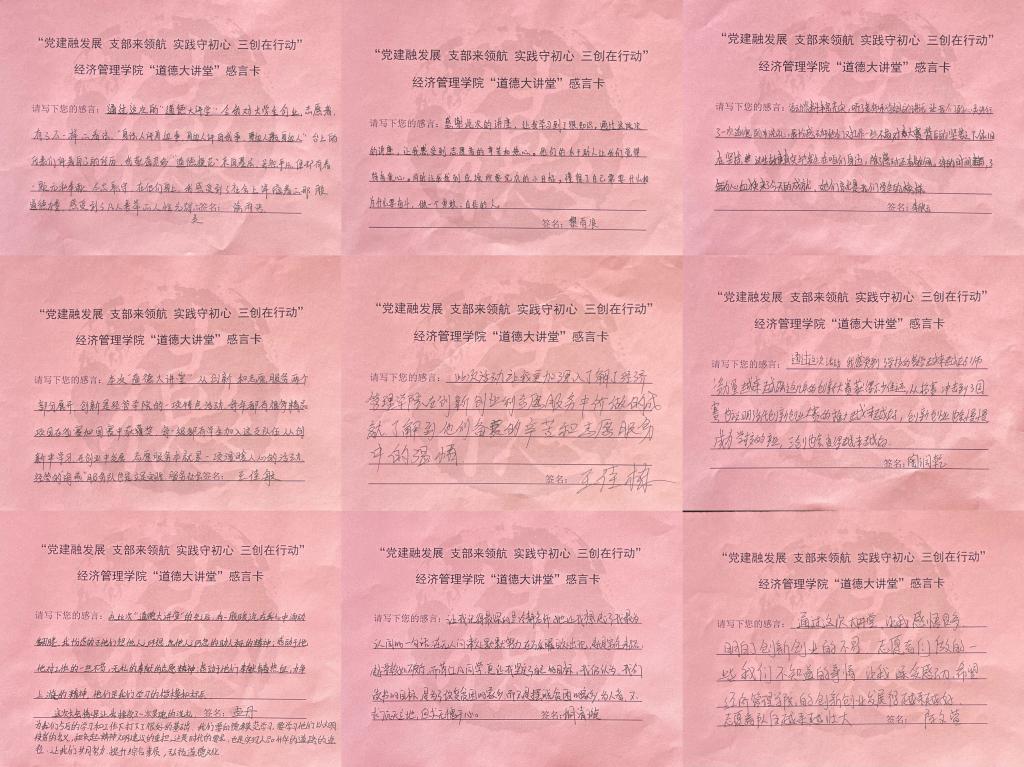 活动最后,大家在感言片上写下自己参加本期活动后的感悟、体会和祝福。纷纷表示,宣讲人的事迹深深感动和鼓舞着大家,通过本期道德大讲堂学习,将以高度的责任感和使命感,进一步增强四个意识,把握正确方向,积极探索,开拓创新做好各项工作,为推动公司发展贡献智慧和力量。