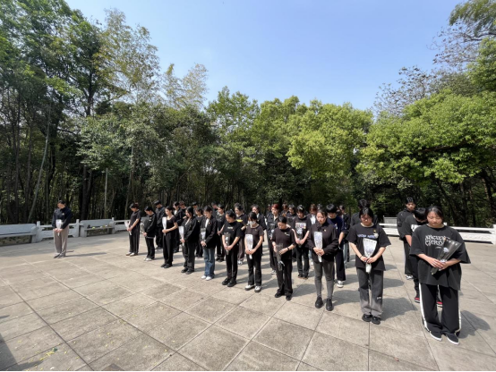 当天下午,同学们乘坐大巴车前往烈士陵园,路上同学们唱着红歌,用歌声表达对烈士们的深深怀念。到达陵园后,大家排队有序来到庄严肃穆的大纪念碑前开始活动。