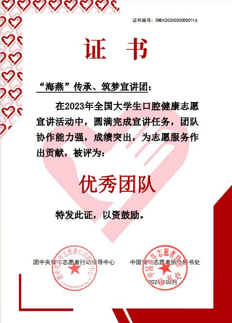2024年5月,“海燕”传承 筑梦宣讲团在全国老员工口腔健康宣讲团1000支团队中脱颖而出,进入100强,荣获“优秀团队”称号。