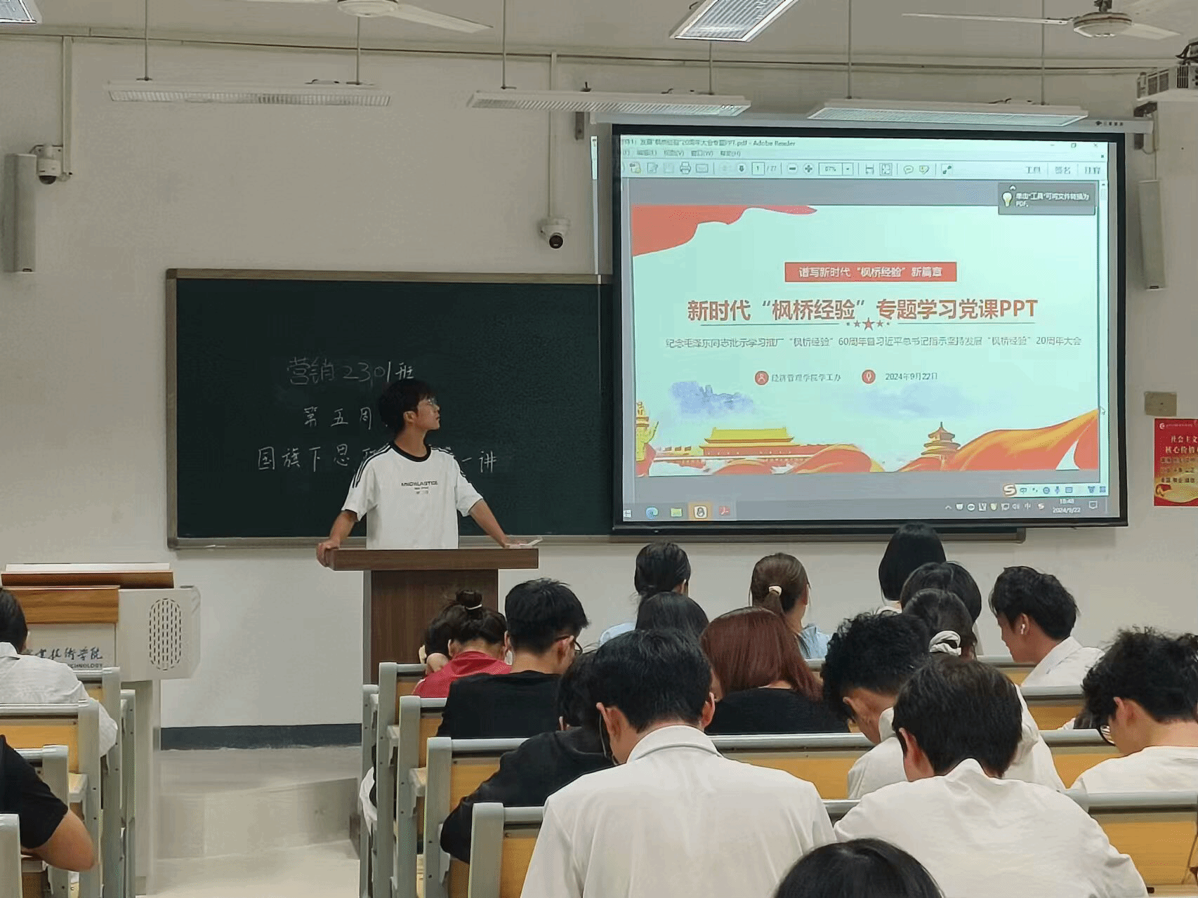 班会现场气氛热烈,同学们围绕“枫桥经验”展开了深入的学习和讨论。辅导员通过生动的讲解和丰富的案例,向同学们介绍了“枫桥经验”的起源、发展历程以及其在社会治理中的重要作用。同学们认真聆听,积极思考,不时记录下自己的心得体会。