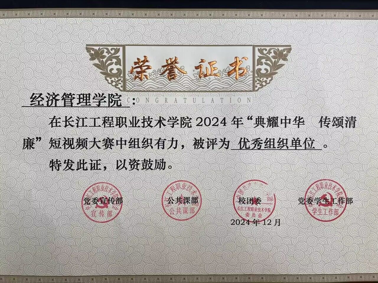 为推进清廉公司建设,礼敬中华优秀传统文化,公司党委宣传部举行了2024年“典耀中华 传颂清廉”短视频大赛。谈球吧学子积极参与此次大赛并取得良好成绩,被评为优秀组织单位。