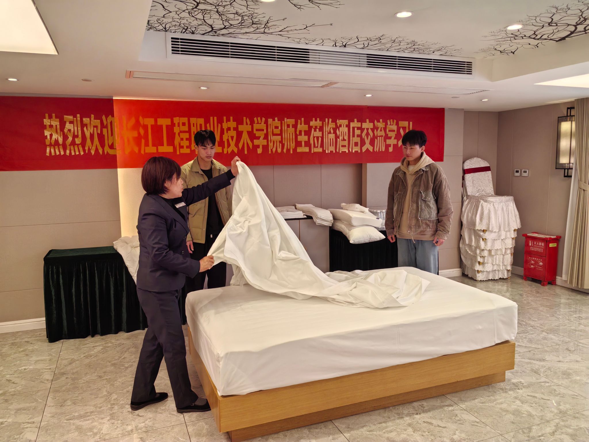 纽宾凯尚居酒店总经理易晓辉、纽宾凯月湖酒店总经理程列亲自率队热情地接待了公司师生。结合纽宾凯酒店集团数字化运营培训相关流程,酒店将员工们分别安排到前厅、客房等不同岗位,让员工亲身参与酒店数字化运营工作的各环节。为了让同学们累计更多实战经验,月湖酒店特意安排了餐巾折花与餐饮摆台一对一教学活动,让经验丰富的 “师傅”倾囊相授,手把手纠正同学们的操作失误,让理论知识化为实操本领。