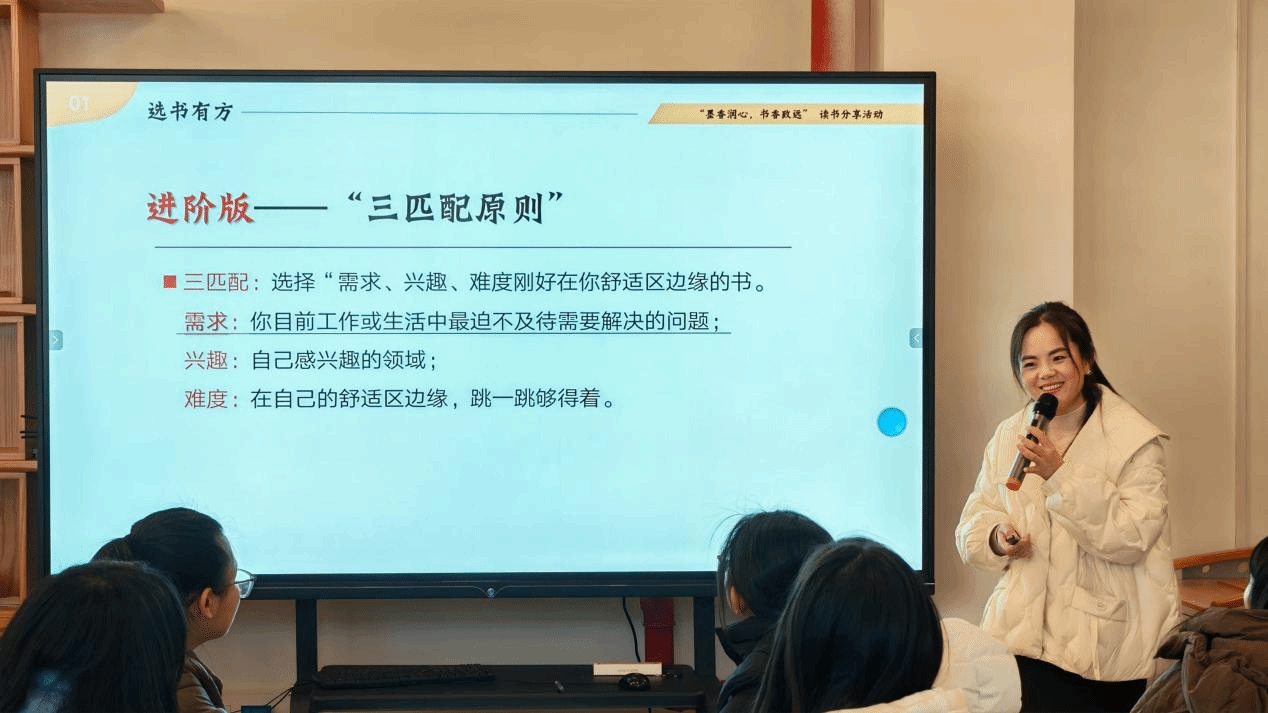 分享会上,王倩围绕“选书有方、读书有法、终身为伴”三个方面展开分享了多种实用的阅读技巧,如精读、略读、批注阅读等,帮助同学们提高阅读效率。她强调读书不仅仅是获取知识的过程,更是一种修身养性、启迪智慧的生活方式,鼓励大家将读书作为终身的爱好;同时,为同学们推荐了一系列古今中外的经典书籍,并阐述了如何根据个人兴趣和成长需求选择适合自己的书籍。