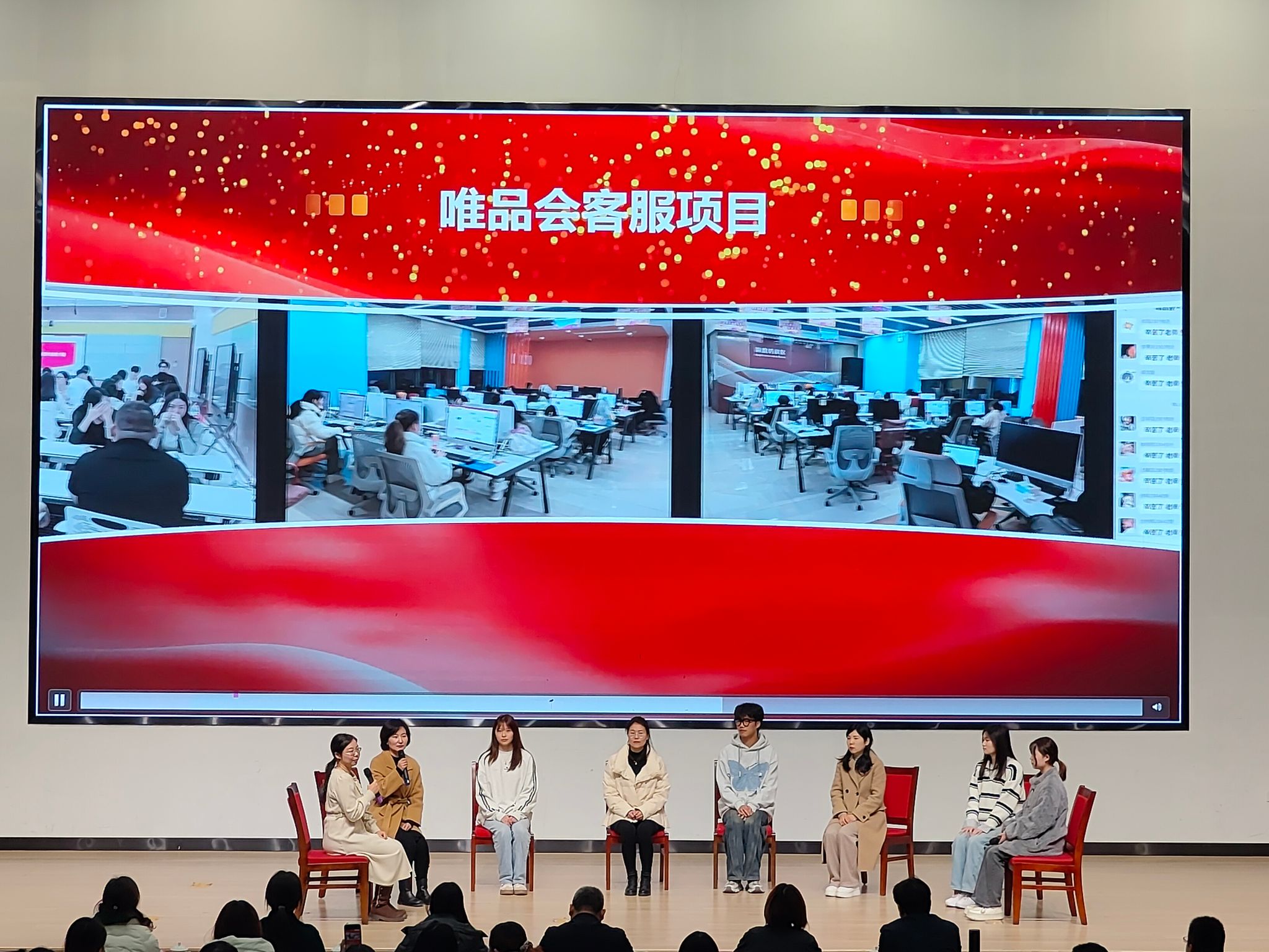 员工代表曹忆、吴康平、邢佳妮、王欣讲述了自己在客服、仓储、直播工作岗位上的经历,感谢公司提供了良好教学实践平台,鼓励学弟学妹们要珍惜实习机会,勇敢地去尝试、去探索。