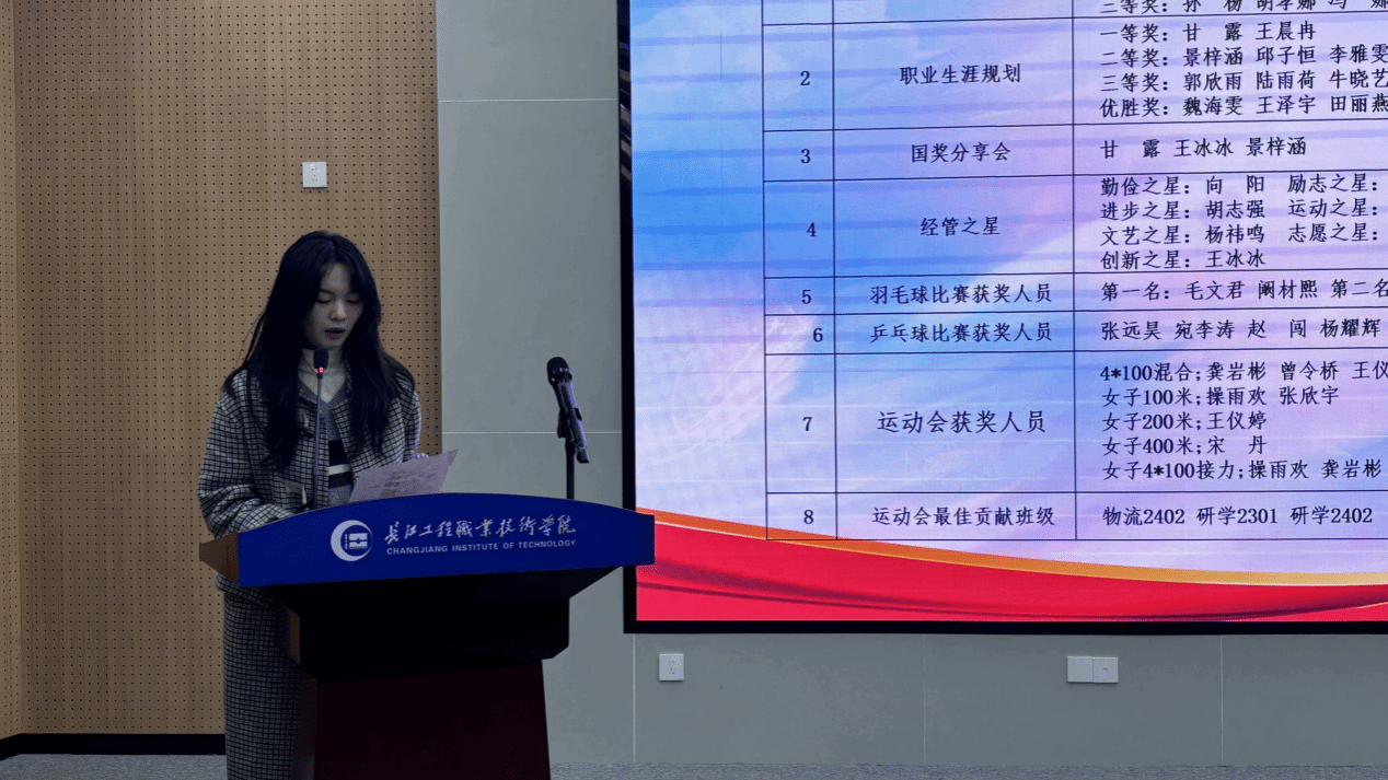 会上,钱翠翠宣读了表彰人员名单,表彰范围涵盖学风建设、运动会、消防安全等多个领域。这些奖项不仅是对获奖同学们在学习、生活、社会实践等方面突出表现的肯定,更是对全体学子的一种激励。