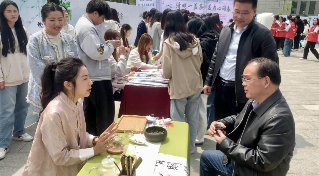 活动现场设置了六大传统文化体验区。同学们提笔“书法怀远”,誊写清明诗词;执扇“彩绘纸鸢”,勾勒春日图景;围坐“诗词飞花”,以“春”为令对诗接句,千年文脉跃然唇齿;轻叩“空灵鼓韵”,乐手轻叩慢击,古韵新声随指尖跃动;在“非遗扎染”区,蓝白相间的布艺作品凝结匠心;而“艾叶调香”则让传统草药香气弥漫全场。