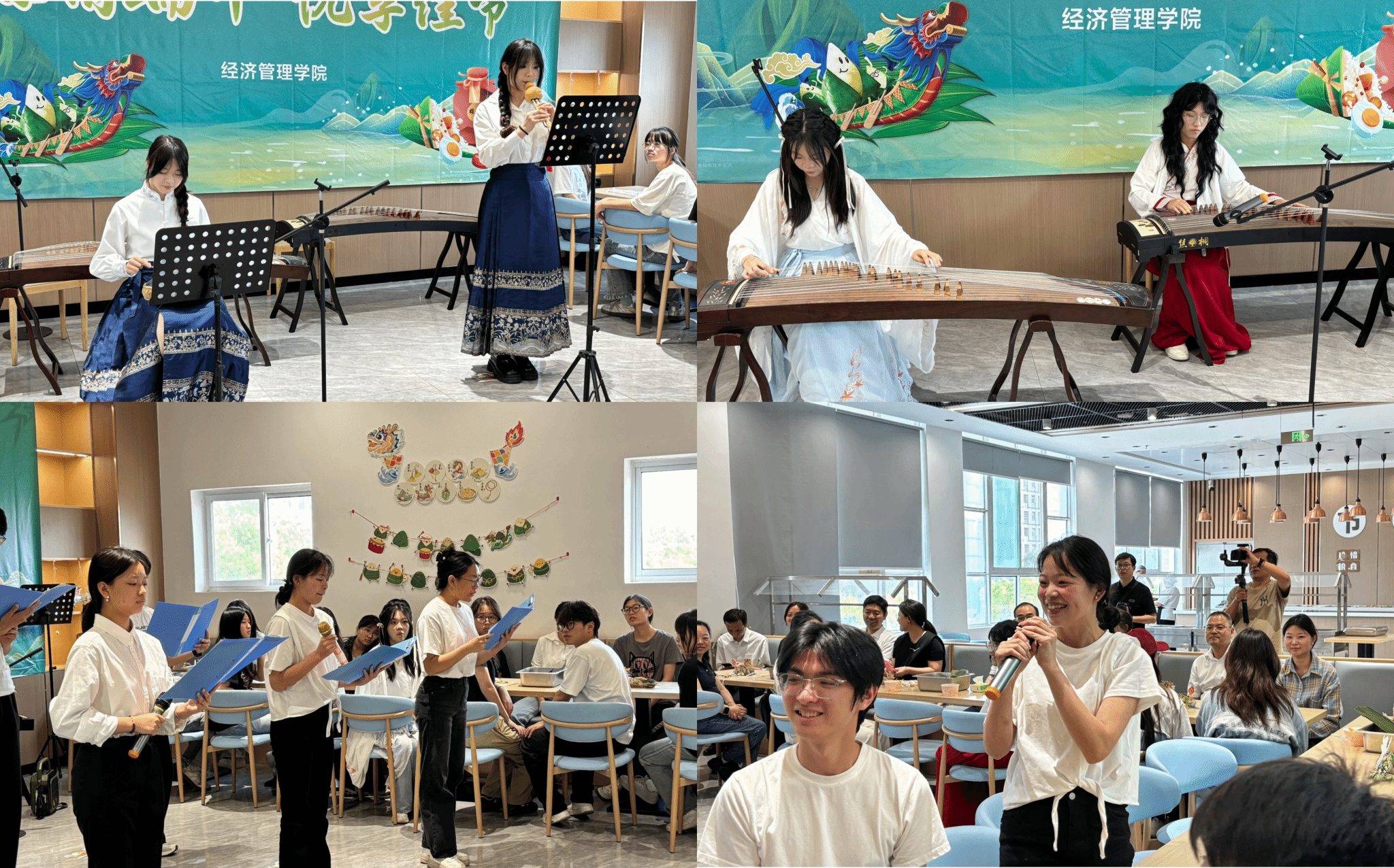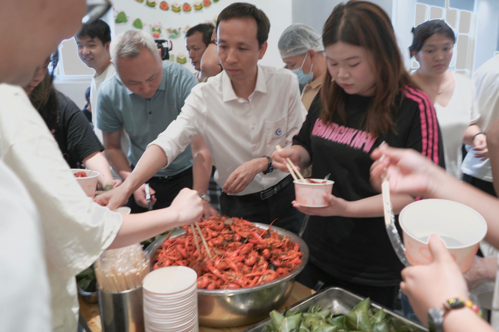 最富节日气息的包粽子环节在清雅的古筝伴奏中温馨开启。糯米、粽叶、蜜枣在指尖翻飞,老师与同学们一起捋叶、填米、捆扎,笑语盈盈,其乐融融。后勤管理处更贴心准备了时令美味——小龙虾,与师生亲手包制、现场煮制的香粽一同分享。粽香与龙虾的鲜香交织,师生围坐,品粽尝鲜,在味蕾的满足中感受节日温情。