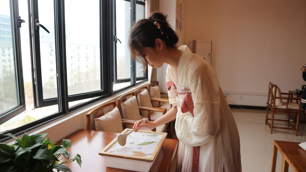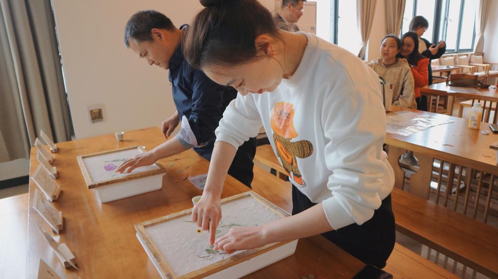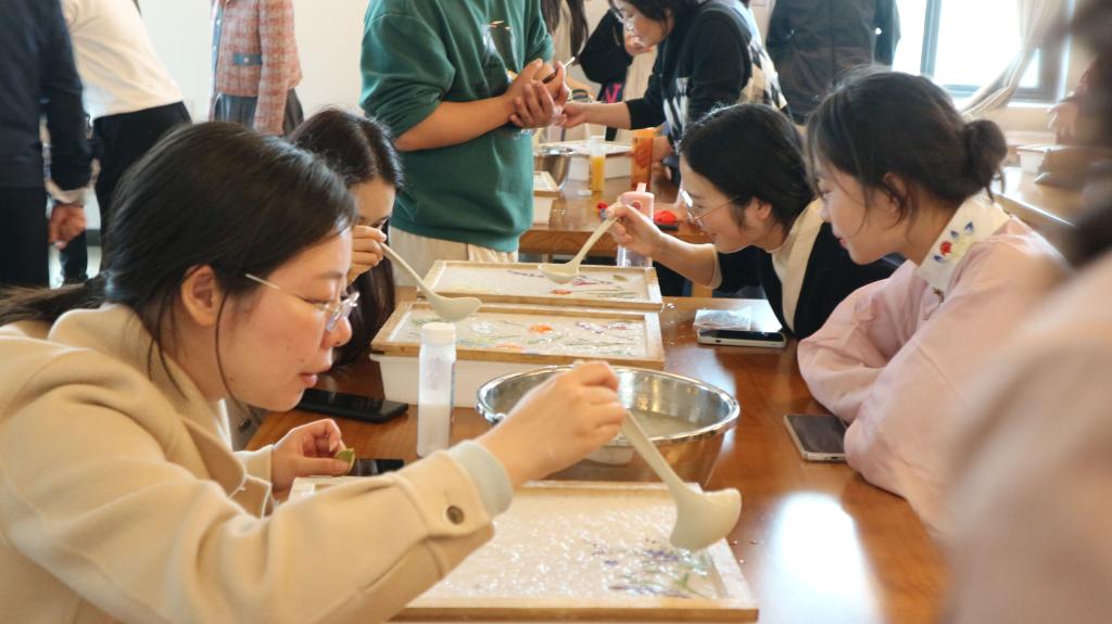 老师同学们踊跃地体验了单张抄纸、花草装饰和浇浆等过程,充分感受到了非遗文化经过岁月沉淀的魅力,在生机盎然的春季把对新一年的美好憧憬与希望用一张张亲手制作、设计的花草纸展现出来。