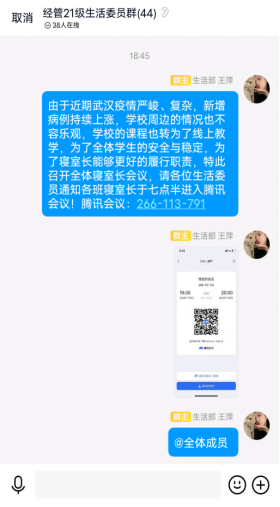 11月26日下午,谈球吧召开了校园疫情防控员工寝室长线上工作会议。本次会议由公司员工会指导老师、辅导员杨园燕主持,分团委书记、辅导员翟睿以及2021、2022级全体寝室长参加。