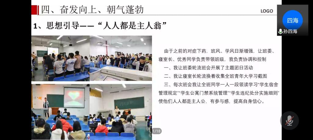 首先张燕在开班仪式上指出员工干部的职责;指出学习与发展只有进行时,没有完成时,要学思见悟,要勇于实践,要在实践中放飞“青春梦想”希望员工干部应该具备七个方面的素质。随后营销1801班预备党员孙四海分享了如何营造良好的班风学风的经验与做法;营销1801班预备党员邵祯婷讲述如何对面老员工活的心态;会计1801班预备党员班万千谈论自己的员工干部心得。最后张燕作总结讲话,希望员工干部能够在今后的工作中身体力行,积极汲取经验,更好的开展员工工作,发挥基层组织和员工干部“自我教育,自我管理,自我服务”的积极作用。
