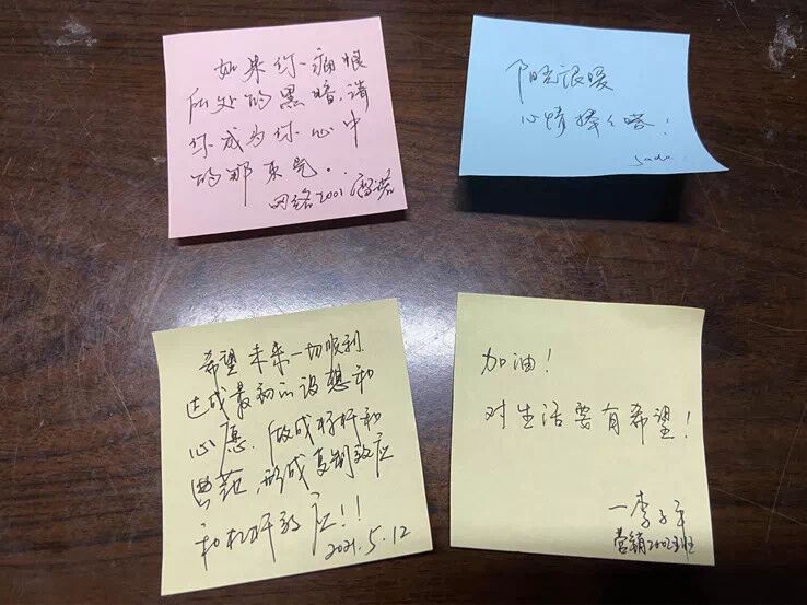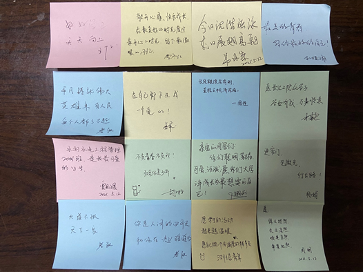 活动现场人头攒动,深受同学们欢迎。分享小故事的同学领取到一张公司专属明信片,还有许多同学留下了对未来的期望。经过团委公众号投票,选出移动商务2001班郭采灵、会计2003班邱园媛、地信2001班段小莉等校园十大暖心小故事。许多老师也为同学们带来寄语。